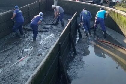 Técnicos y operarios de Aguas Rionegrinas ejecutan tareas de limpieza del sedimentador en la Planta Potabilizadora local como parte del mantenimiento preventivo del sistema de producción de agua potab...