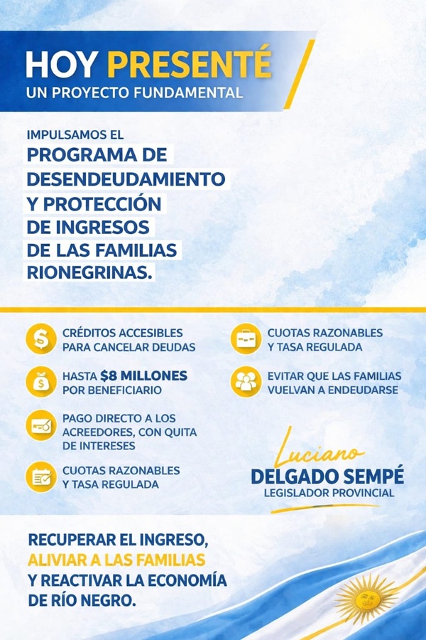 El legislador provincial Luciano Delgado Sempé presentó el Proyecto de Ley (Expte. Nº 441-26) que crea el “Programa de Desendeudamiento y Protección de Ingresos de las Familias Rionegrinas”, una iniciativa destinada a dar respuesta a la grave situación de sobreendeudamiento que afecta a miles de hogares en la provincia.
