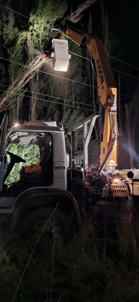 El fuerte temporal volteó árboles, arrancó ramas y provocó que muchas de ellas cayeran sobre las líneas de media y baja tensión, generando cortes e importantes daños en la infraestructura. Los equipos técnicos debieron operar en condiciones climáticas adversas y un escenario por demás complejo, priorizando la seguridad y la restitución del servicio en los sectores más afectados.