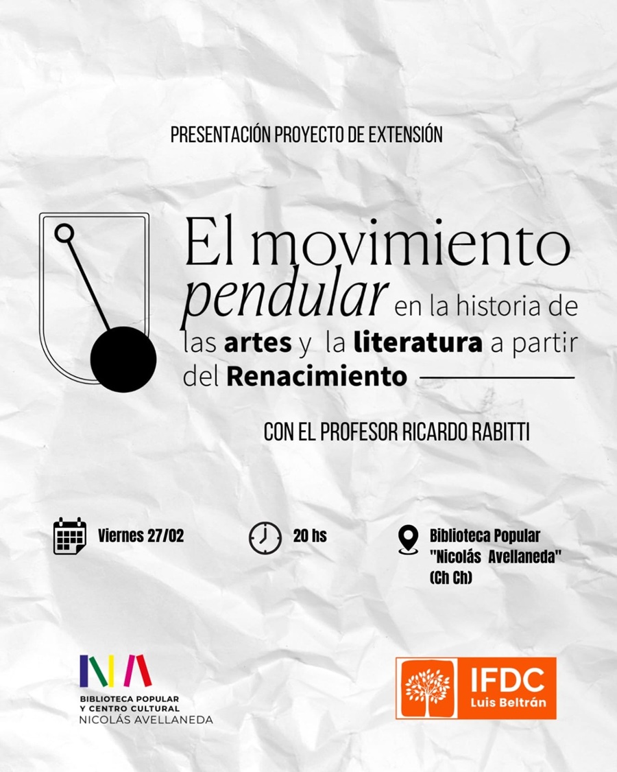 El Instituto de Formación Docente Continua de Luis Beltrán invita a la comunidad a la presentación del proyecto “El movimiento pendular en la historia de las artes y la literatura a partir del renacimiento”. El encuentro tendrá lugar el viernes 27 de febrero a las 20 horas en las instalaciones de la Biblioteca Popular Dr. Nicolás Avellaneda, de la localidad de Choele Choel.