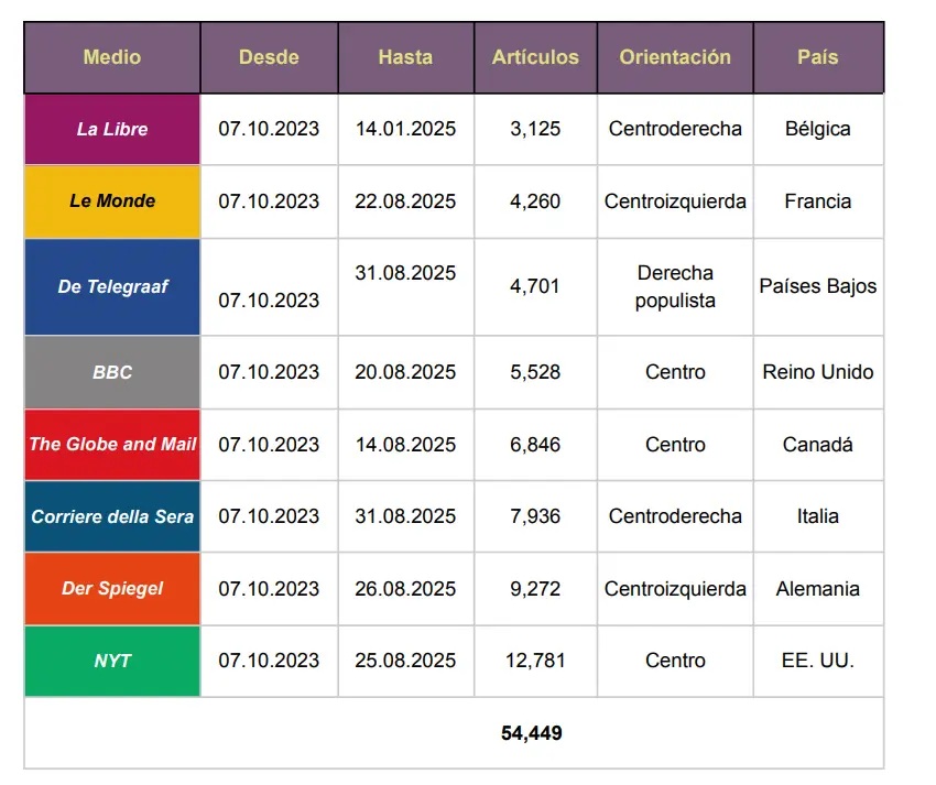 El relevamiento detectó estas distorsiones en medios percibidos como referentes de calidad informativa, entre ellos The New York Times, Der Spiegel y The Globe and Mail. También fueron analizados BBC, Le Monde (Francia), La Libre Belgique (Bélgica), Corriere Della Sera (Italia) y De Telegraaf (Países Bajos).