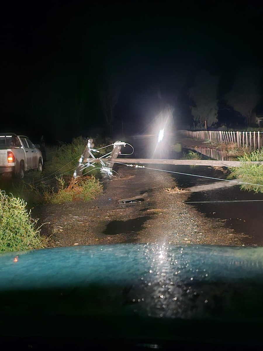 En Chimpay, a las 20:15 se produjo un corte general de energía luego de que el techo de una vivienda volara por efecto del viento y cayera sobre el alimentador troncal que abastece a la ciudad. Las cuadrillas actuaron con rapidez y el servicio ya fue restablecido en su totalidad.